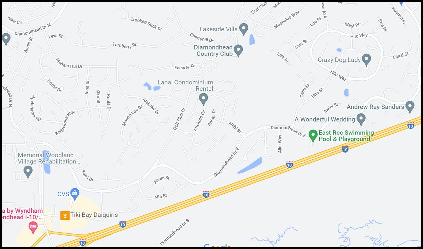 Directions from exit 16 off of I-10 W in Diamondhead, MS: Merge onto Gex Drive. Travel 315 feet and turn right onto W Aloha Drive. Travel 0.2 miles and turn left onto Kalani Drive. Travel 0.2