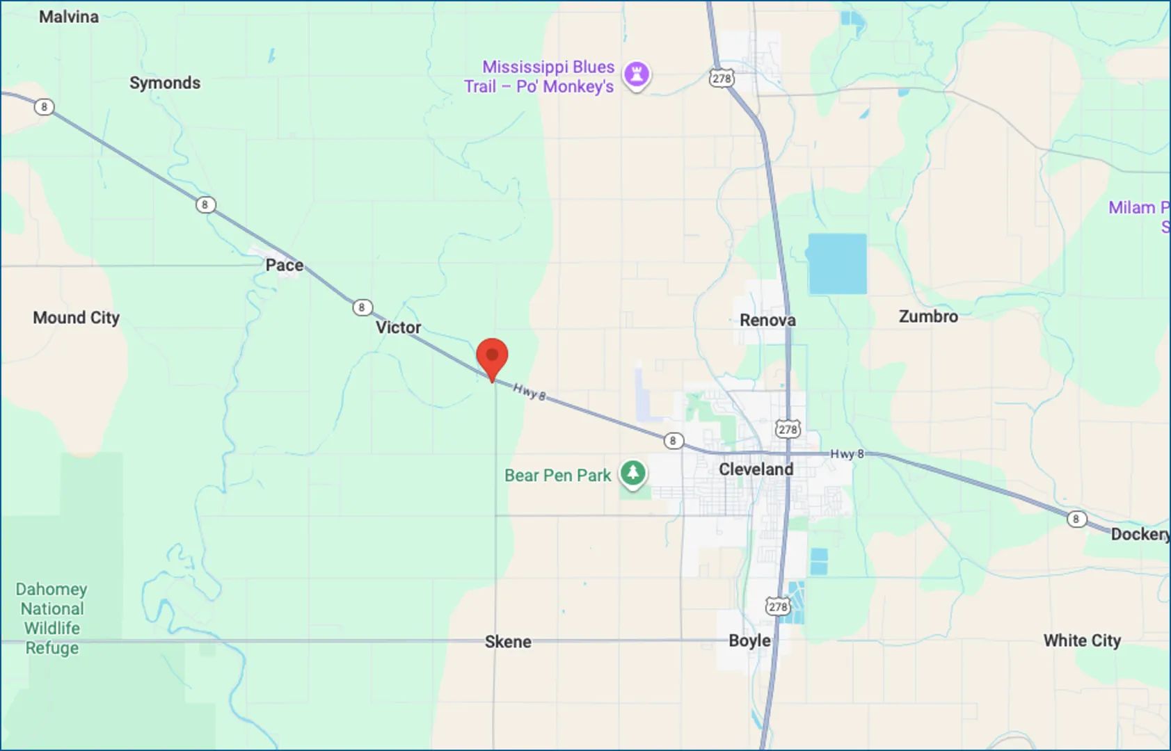 Directions from US-61 & MS-8, Cleveland, MS 38732: Travel on MS-8 W, after 5.0 miles, the home will be on the left.
