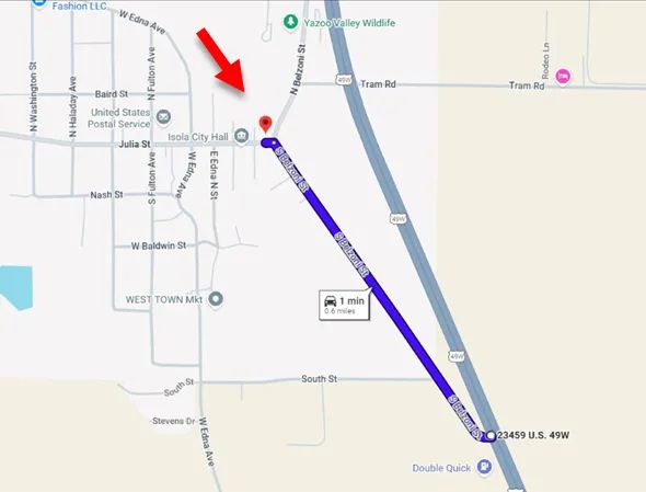 Directions from HWY 49W and S Belzoni St: Head west on S. Belzoni St for .6miles. Turn left on to Julia St and the destination is on your left.