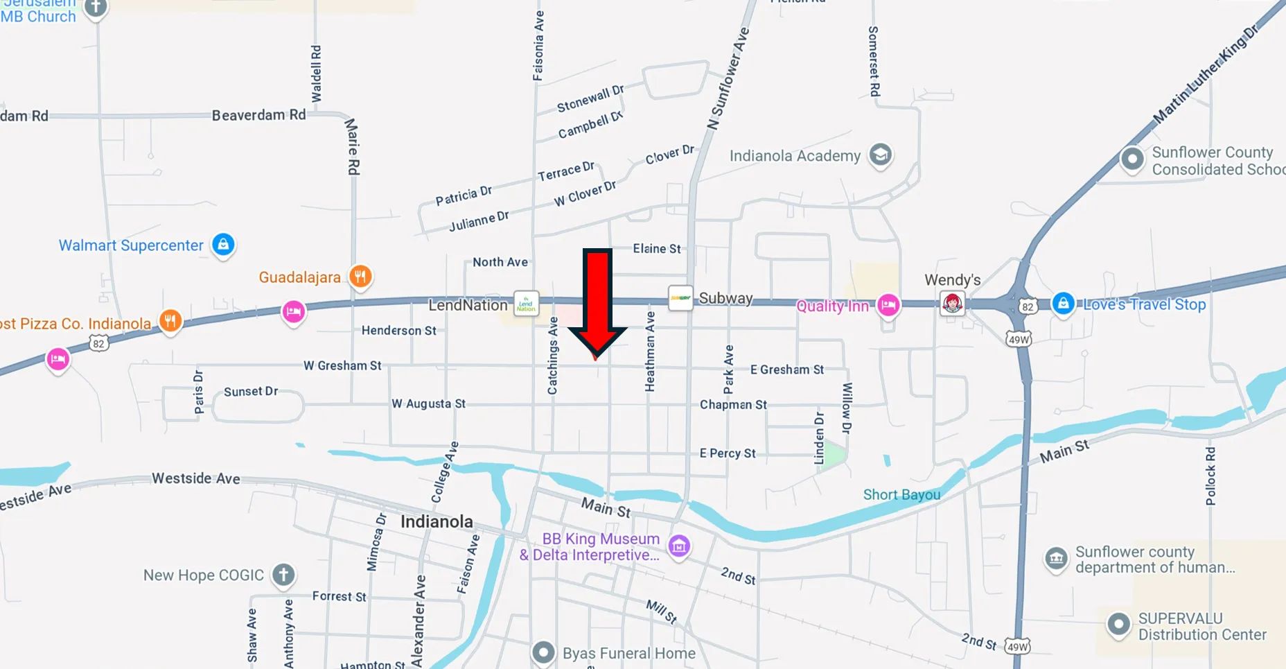 Directions from the intersection of Hwy 49W and Hwy 82 in Indianola, MS: Travel West on Hwy 82 for 2.3 miles. Turn left onto Catchings Avenue, then turn left at the second cross street onto E Gresham St. After 499 feet, the home will be on your left.