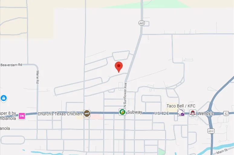 Directions from the intersection of Hwy 49 and Hwy 82 in Indianola, MS: Travel West on Hwy 82 for approximately 0.7 miles, turn right onto N. Sunflower Ave. In 0.3 Miles turn left onto Clover Drive and in 427 feet the house will be on the right.